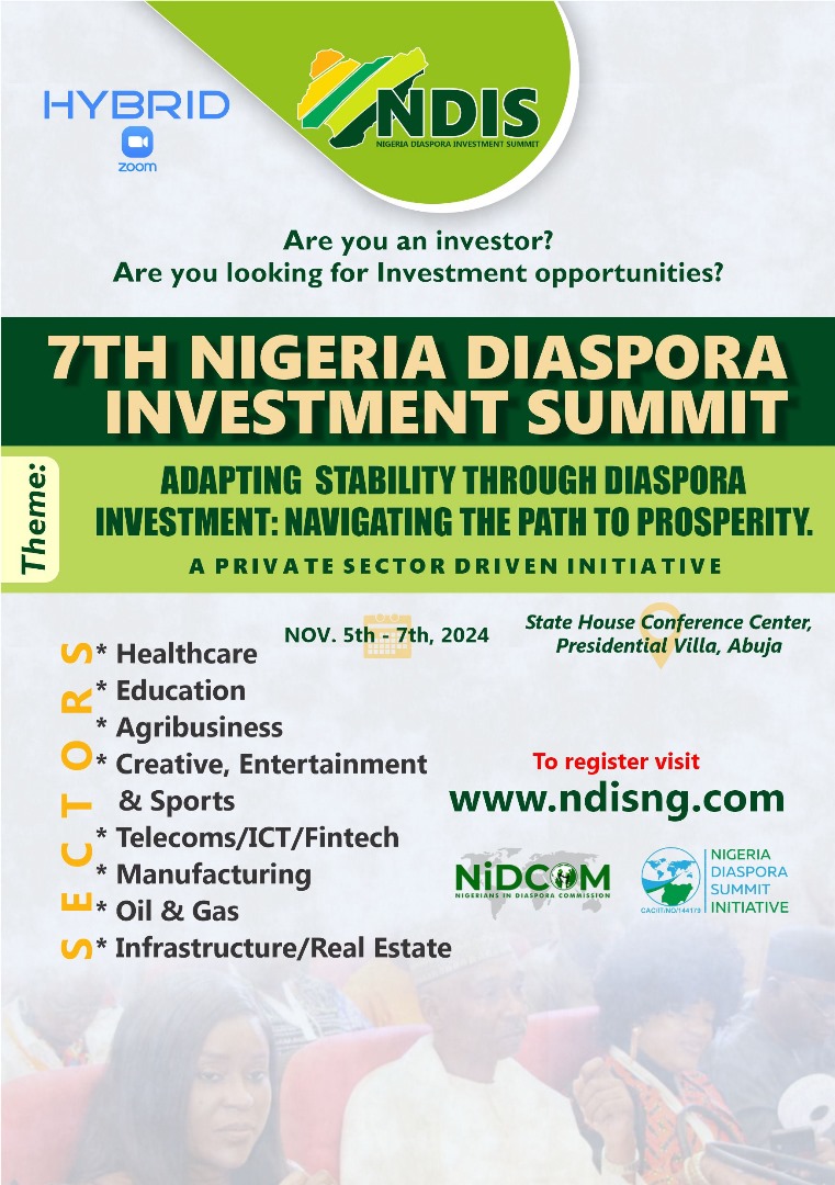 The 7th edition of Nigeria Diaspora Investment Summit (NDIS) 2024 is convened by Nigerians in Diaspora Commission (NiDCOM) in collaboration with Nigeria Diaspora Summit Initiative (NDSI).
